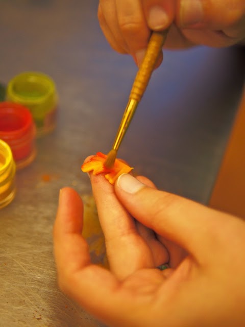 Step thirteen: Paint leaves with green, yellow, and red petal dust.