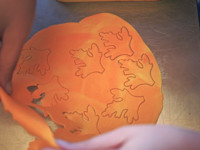 Step twelve: Roll out orange fondant/modeling chocolate and cut out leaf shapes.